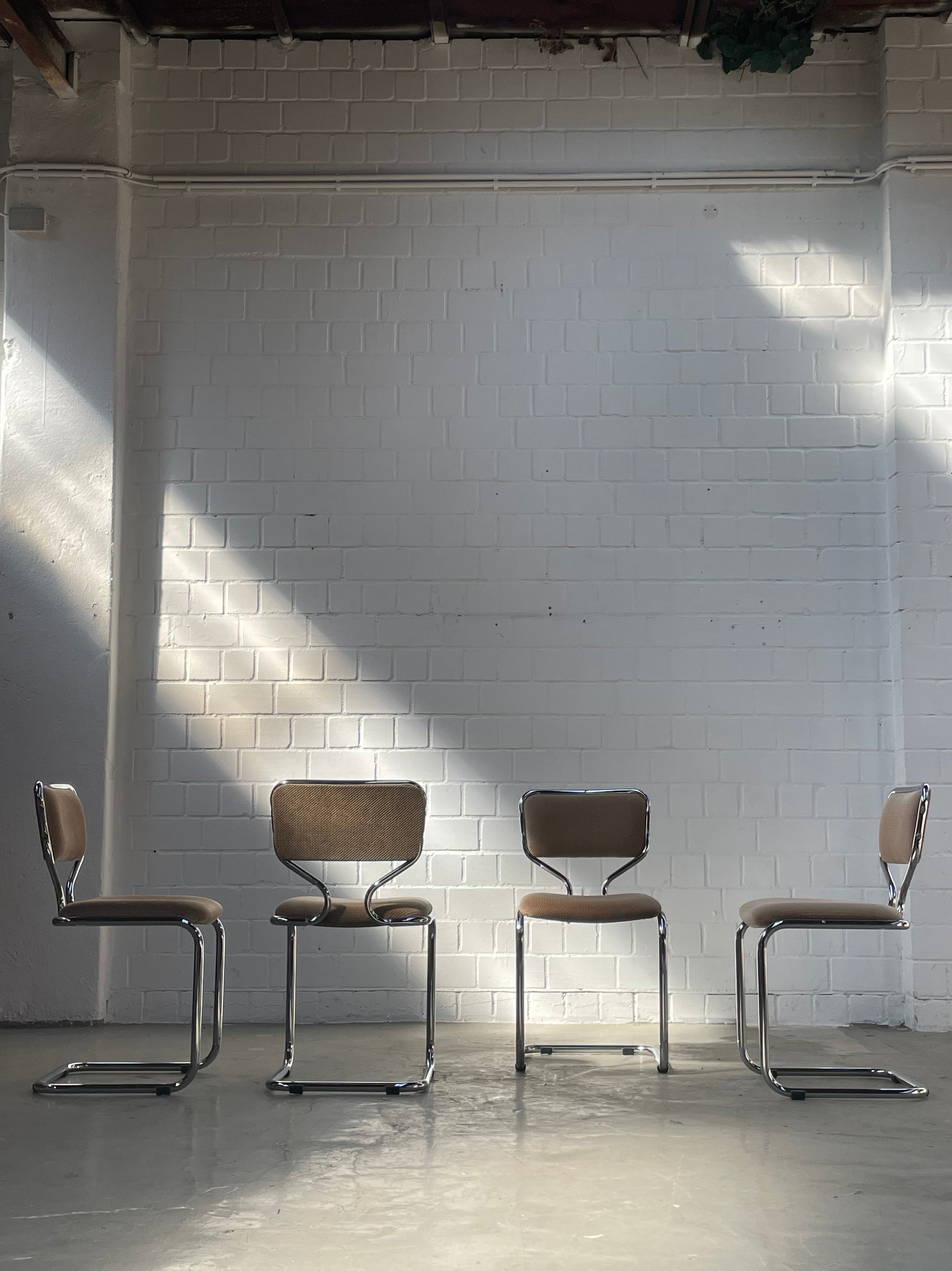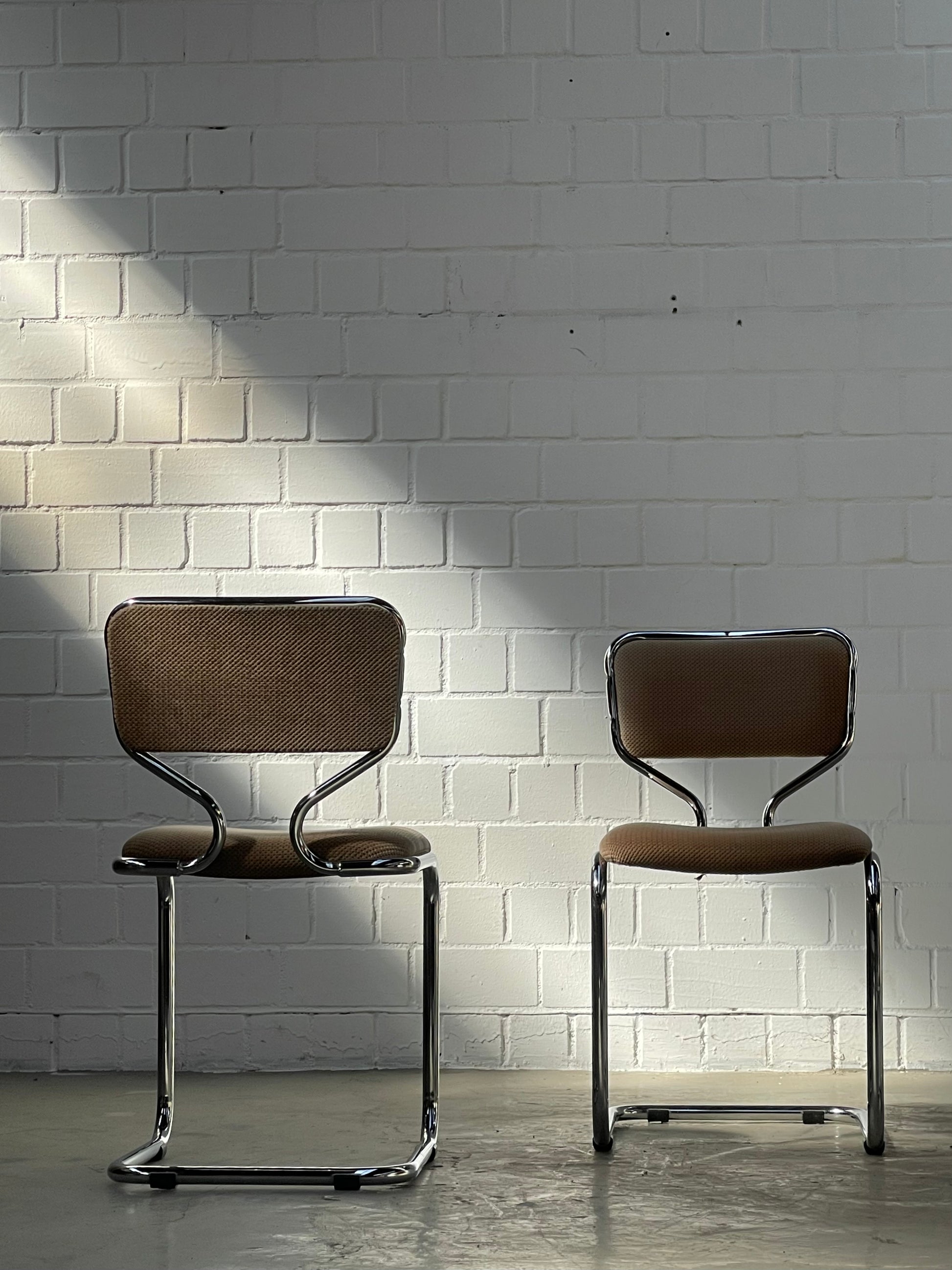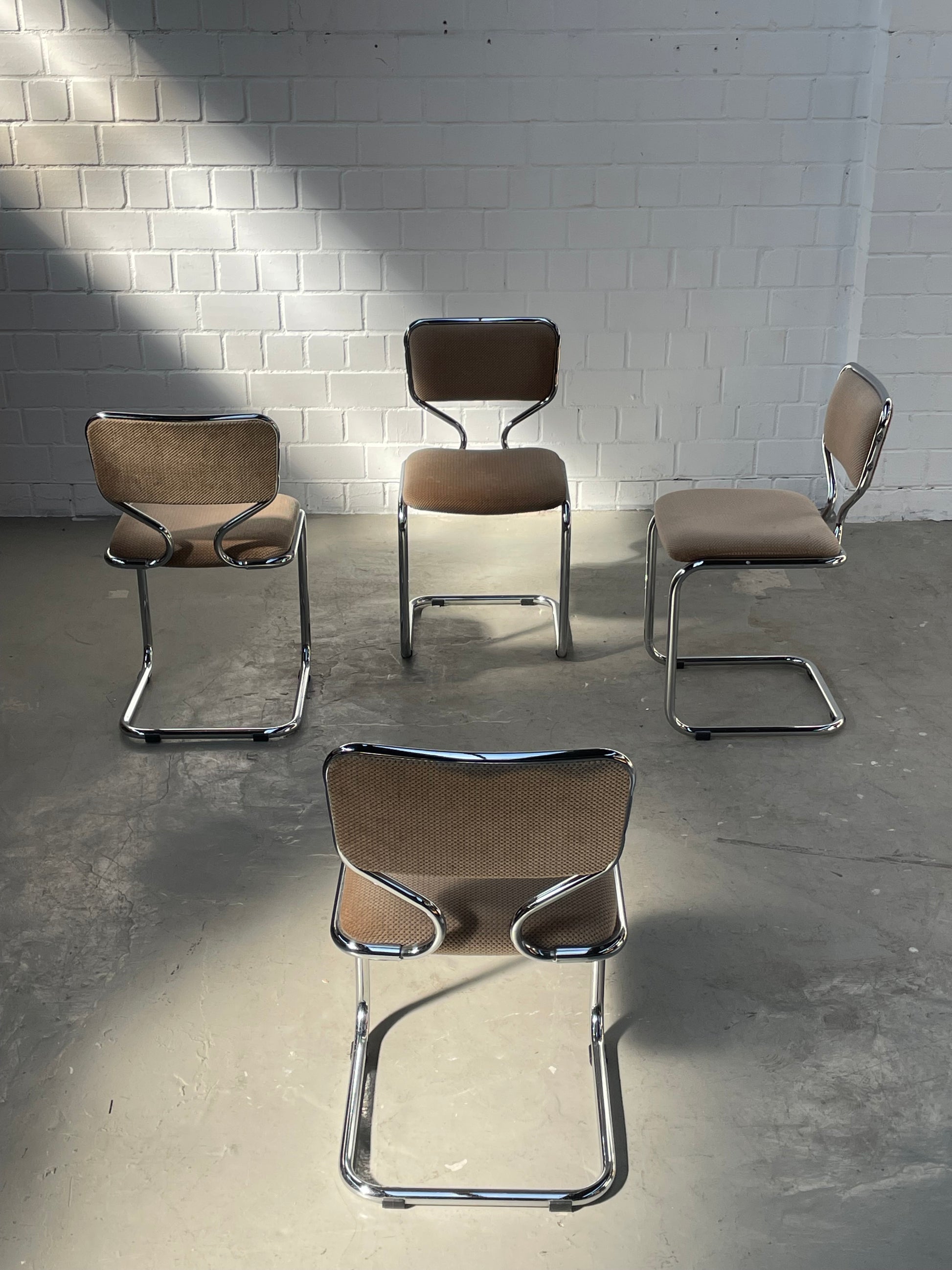 Einer von vier charmanten Space Age Stahlrohrstühlen mit einem verchromten finish und braun gemusterten Oberstoff. Man sitzt außerordentlich bequem und komfortabel.