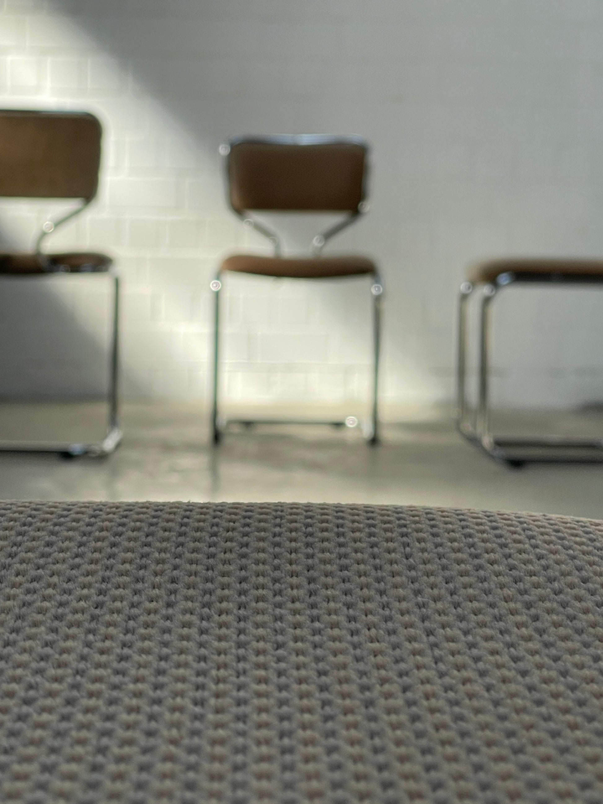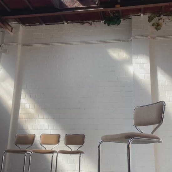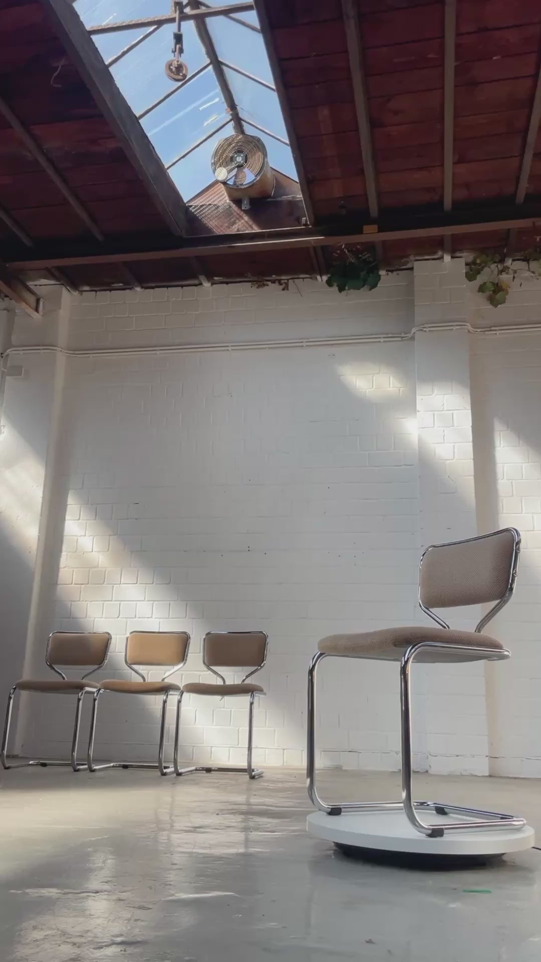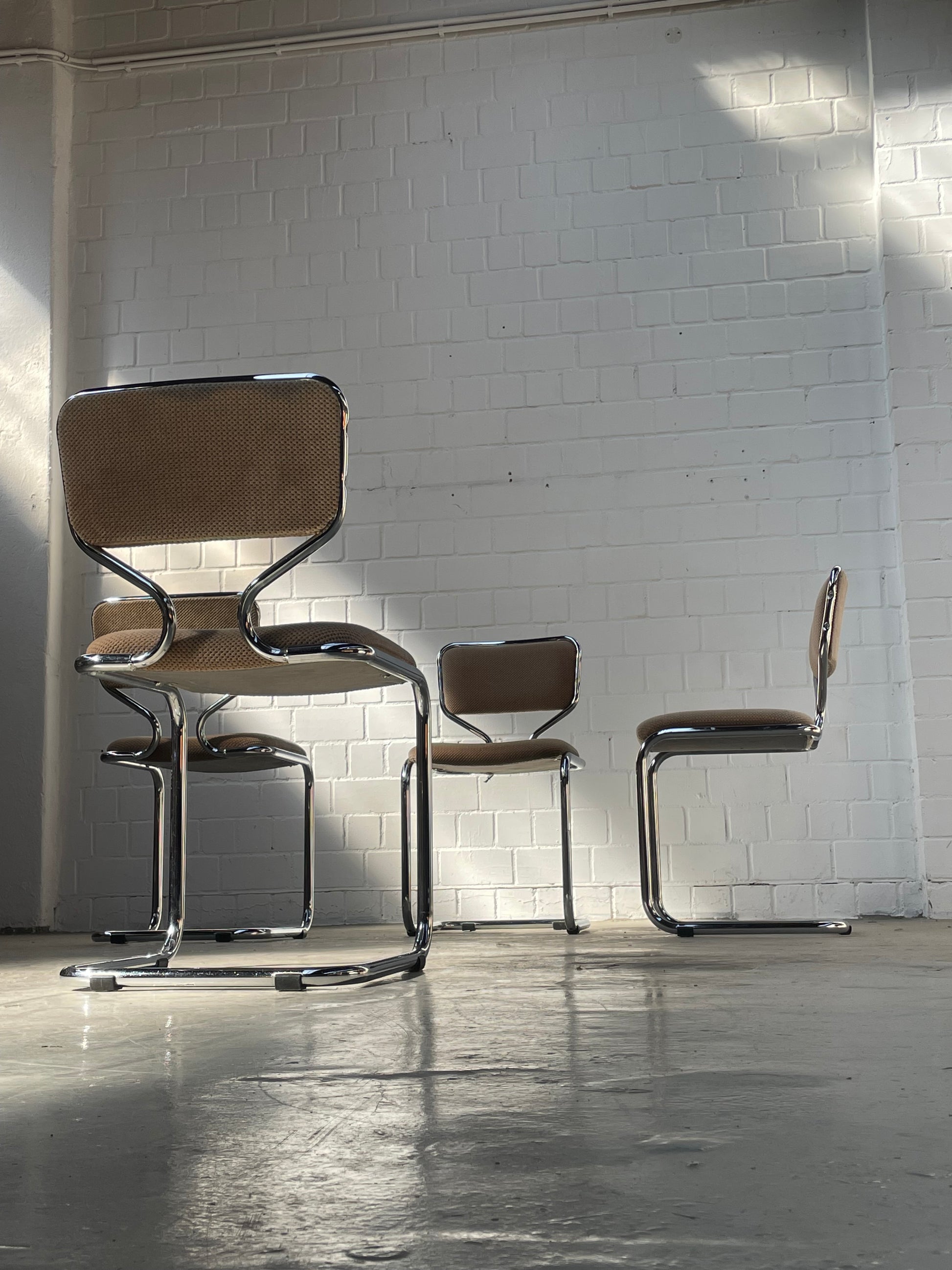 Einer von vier charmanten Space Age Stahlrohrstühlen mit einem verchromten finish und braun gemusterten Oberstoff. Man sitzt außerordentlich bequem und komfortabel.